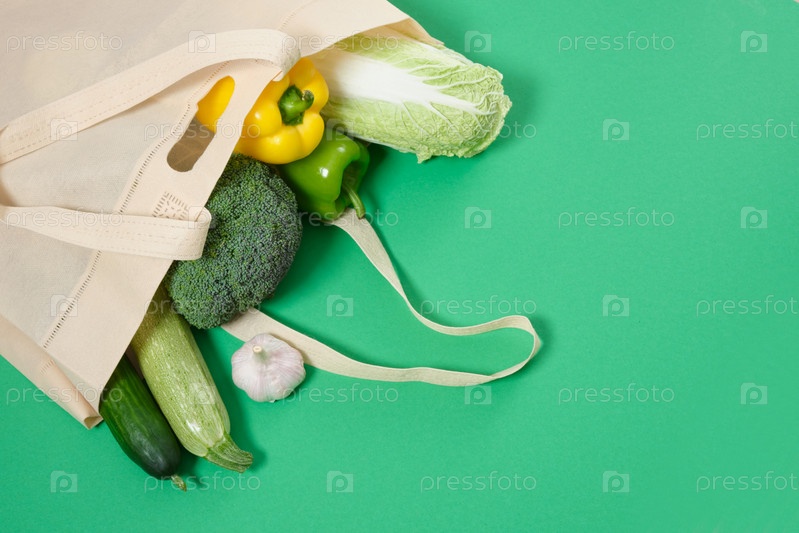 Покупатель ткани с овощами на зеленом фоне