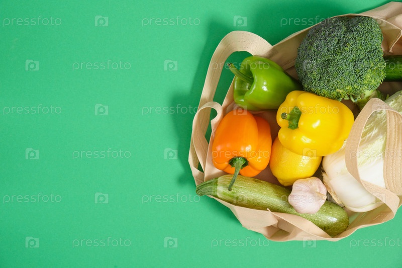 Овощи в тканевой эко сумке на зеленом фоне вид сверху