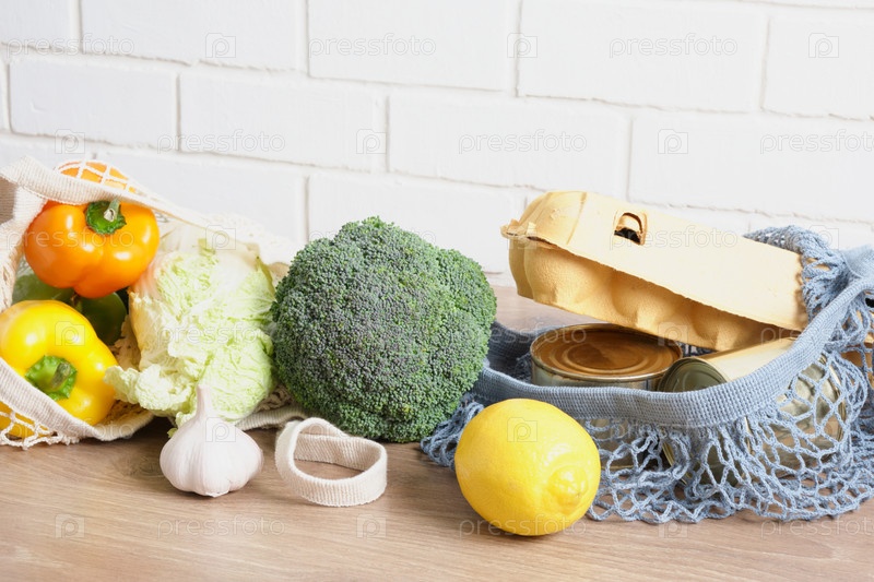 Эко-сумка с едой на деревянном кухонном столе, фон кирпичной стены