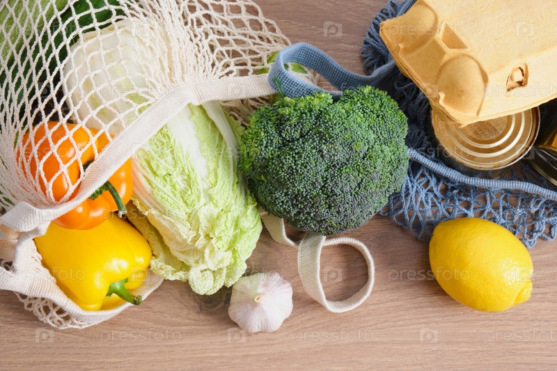 Эко-сумка с едой на деревянном кухонном столе, вязаная сетчатая сумка для покупок, правильное питание и концепция образа жизни без отходов