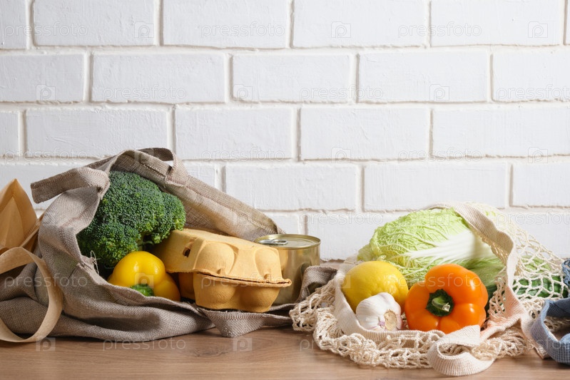 Эко-сумка с едой на деревянном кухонном столе, фон из кирпичной стены, вязаная сетчатая сумка для покупок, правильное питание и концепция нулевых отходов