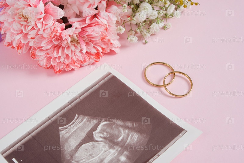 Снимок УЗИ, обручальные кольца и цветы на розовом фоне, осознанное родительство, радость от рождения ребенка в семье