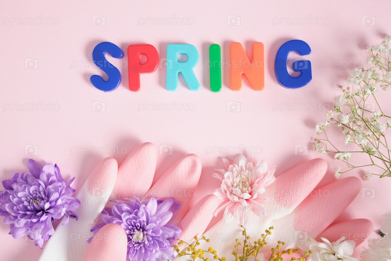 Надпись весна, цветы и резиновые перчатки, концепция весенней уборки, розовый фон