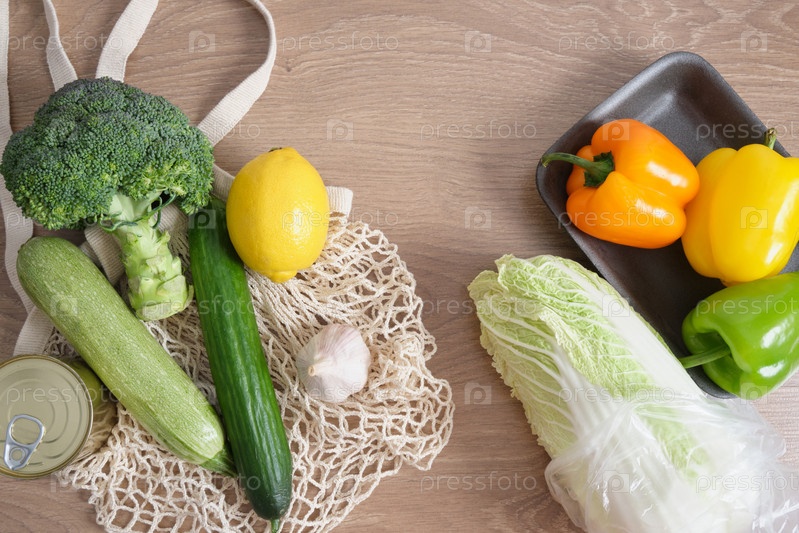Овощи в сетчатой сумке для покупок и пластик, завернутый на деревенский кухонный стол, скажи нет пластику, использование многоразовых покупок, образ жизни без отходов