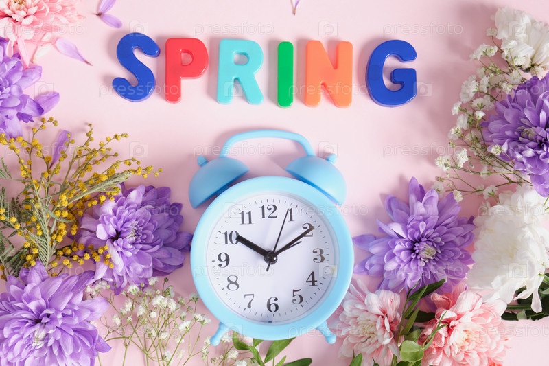 Цветы, будильник и надпись весна на розовом фоне
