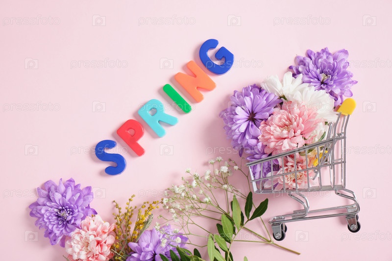 Тележка для покупок, надпись весна в цветах на розовом фоне вид сверху концепция весеннего настроения