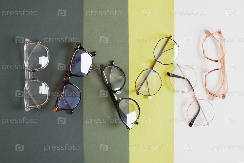 Несколько модных стильных очков на геометрическом зеленом фоне копируют пространство макет