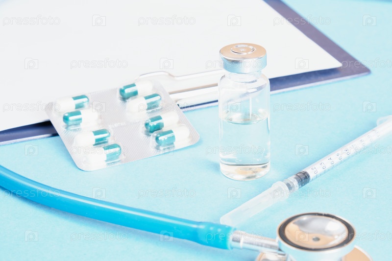 Концепция вакцинации, шприц, флакон с лекарством и стетоскоп на голубом фоне полицейский стол космического врача