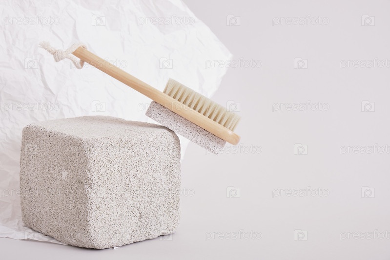 Деревянная натуральная щетка для педикюра на каменной подставке на сером фоне, массаж кистью и концепция очищения кожи