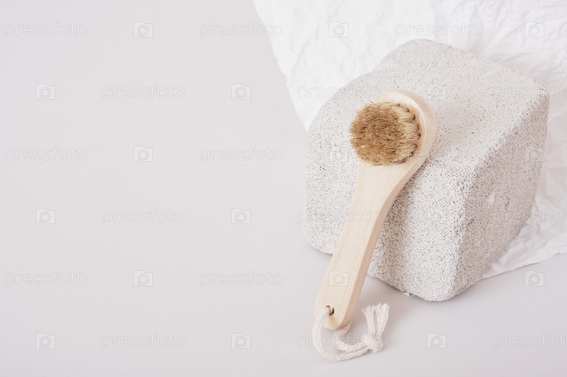 Деревянная натуральная щетка для массажа лица на бетонной подставке на сером фоне, концепция сухого массажа лица копией пространства
