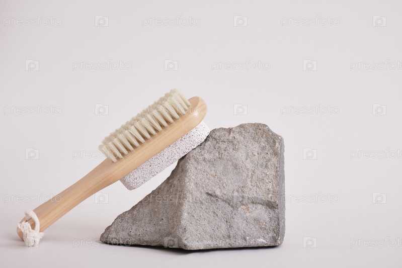 Деревянная натуральная щетка для педикюра на каменной подставке на сером фоне, массаж кистью и концепция очищения кожи