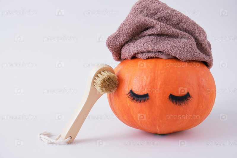 Деревянная массажная щетка для лица, тыква с накладными ресницами и полотенцем на сером фоне, пилинг лица с массажем сухой щеткой