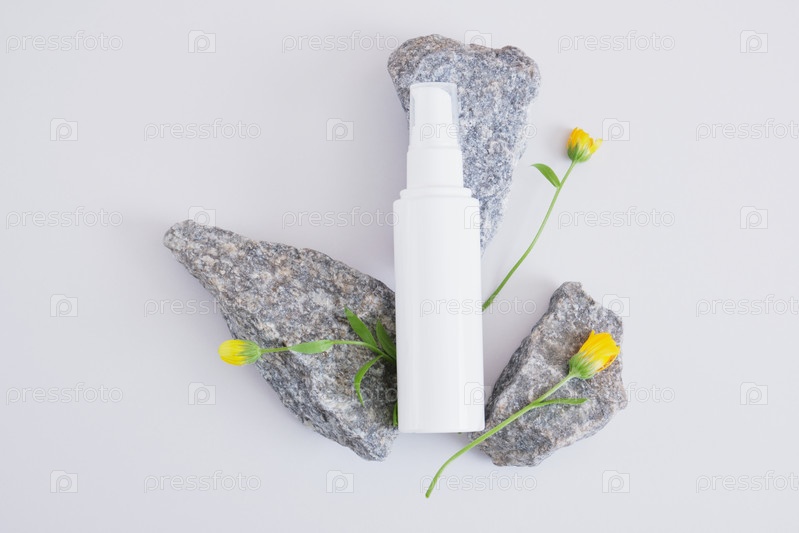 Красивые маленькие цветы и белая пустая бутылка крема или лосьона для тела на камнях на сером фоне. Концепция натуральной эко-косметики. Экологичный спа-продукт по уходу за кожей. Макет