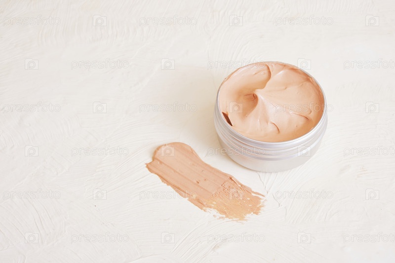 Открытая банка с розовой глиной на светлом фактурном фоне, мазок глины