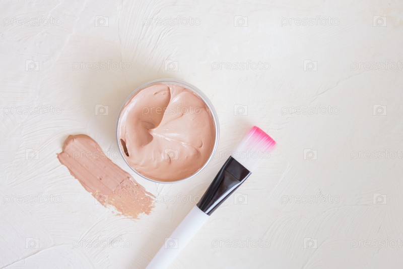Косметическая кисть, открытая банка с розовой глиной на светлом текстурированном фоне или концепция натуральной косметики