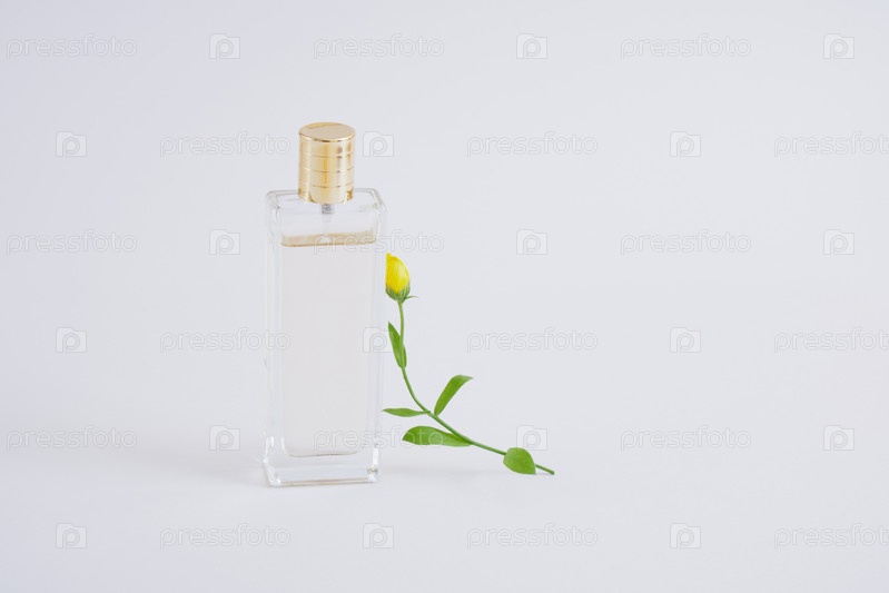 Прозрачный флакон духов на сером фоне. Прозрачное стекло и металлическая медная крышка