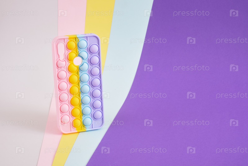 Красочный яркий чехол для смартфона в виде модной модной антистрессовой игрушки вставь его на разноцветный геометрический фон, скопируй пространство, макет