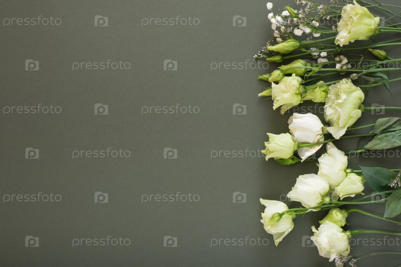 Лимонно-белые и зеленые розы на темно-зеленом фоне, открытка, пространство для копирования, вид сверху, макет плоской планировки