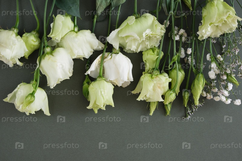 Лимонно-белые и зеленые розы на темно-зеленом фоне, открытка, пространство для копирования, вид сверху, макет плоской планировки