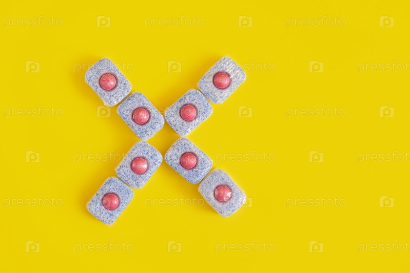 Знак креста из таблеток для посудомоечной машины на желтом фоне вид сверху копией пространства