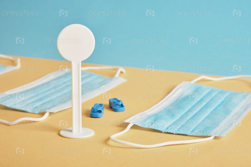 Знак остановки, шлепанцы и маска для лица на синем и бежевом фоне, пляж
