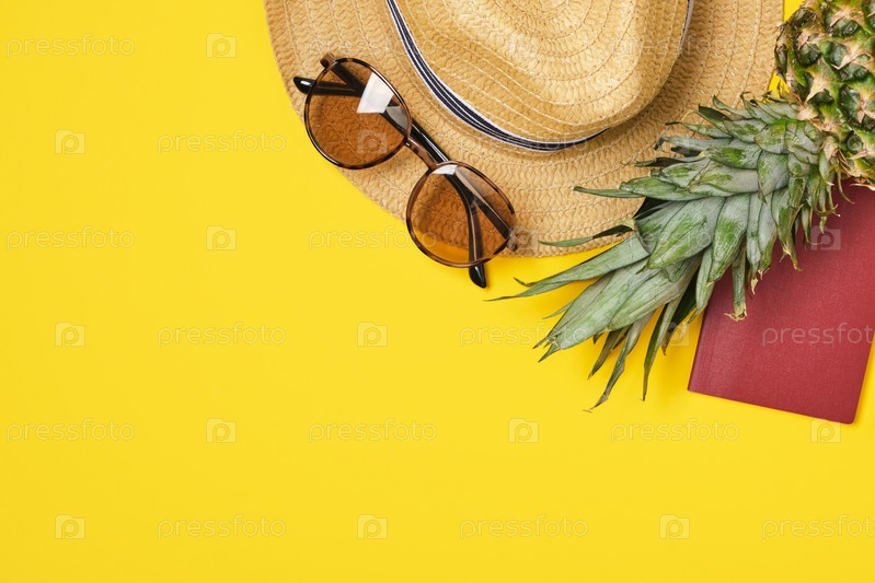 Ананас, шляпа, солнцезащитные очки и загранпаспорт на желтом фоне концепция отпуска в тропиках