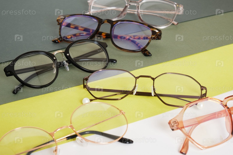 Несколько модных стильных очков на геометрическом зеленом фоне