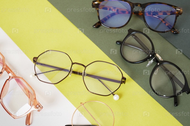 Несколько модных стильных очков на геометрическом зеленом фоне