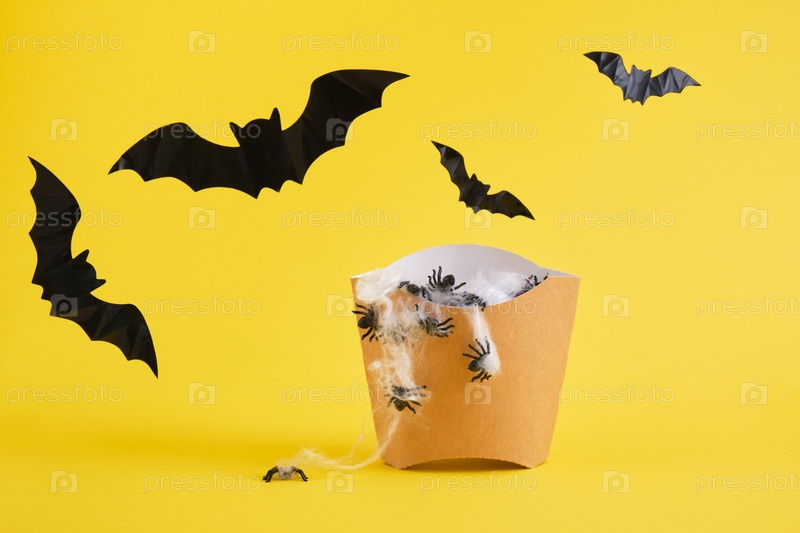 Упаковка фаст-фуда для картофеля фри с паутиной и пауками, декоративные летучие мыши, концепция хэллоуина, желтый фон