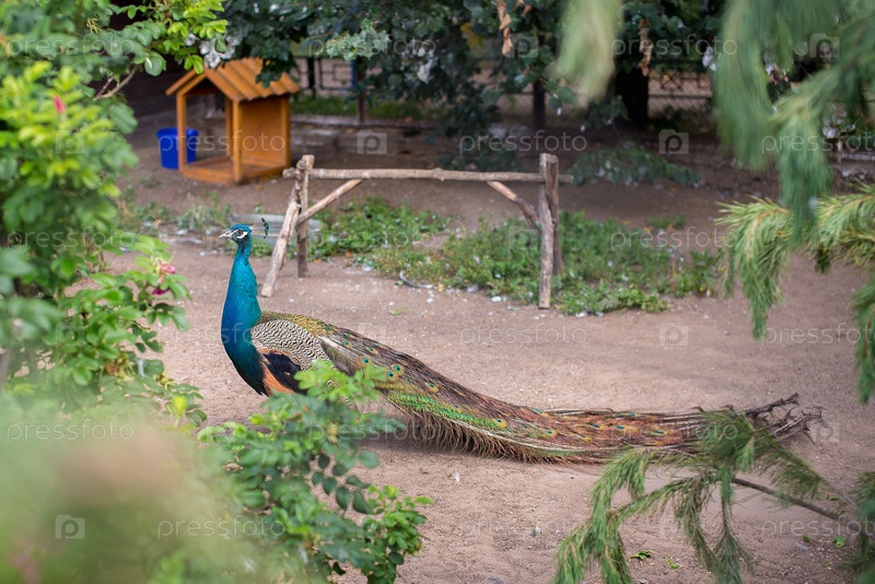Павлин с опущенным хвостом в зоопарке