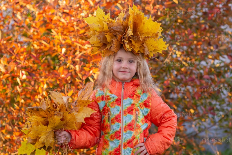 Осень. Девочка держит в руках опавшие осенние желтые красивые листья клена