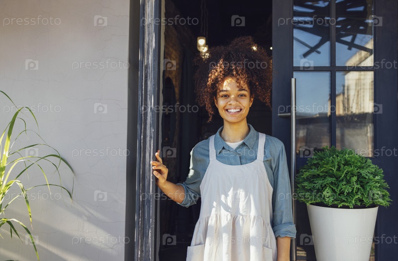 Веселая молодая симпатичная бариста, стоящая у двери