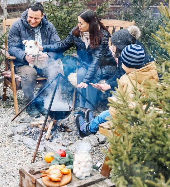 Новогодние посиделки у зимнего костра. Уютный портрет счастливых семейных родителей