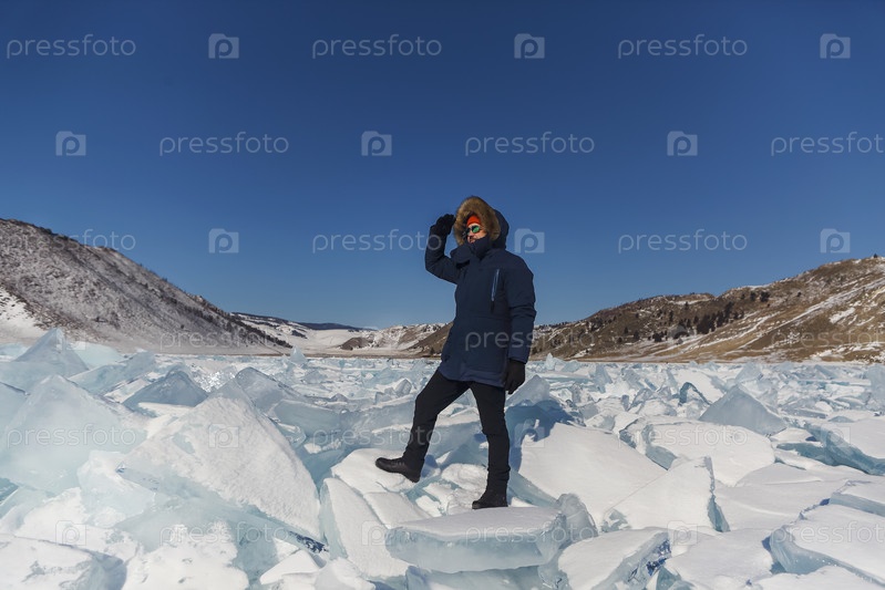 Портрет мужчины-туриста в красной кепке и синей куртке в солнцезащитных очках на льду