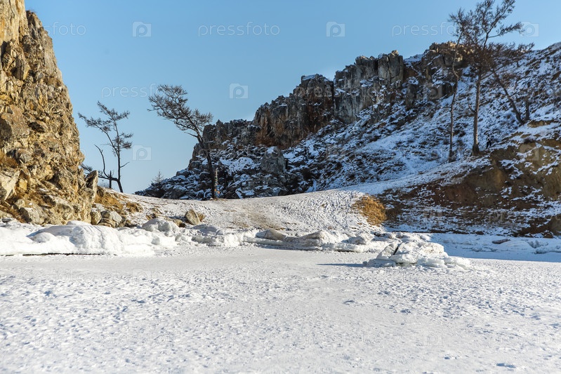 Озеро Байкал зимой. Красивый скалистый остров на фоне голубого неба и льда