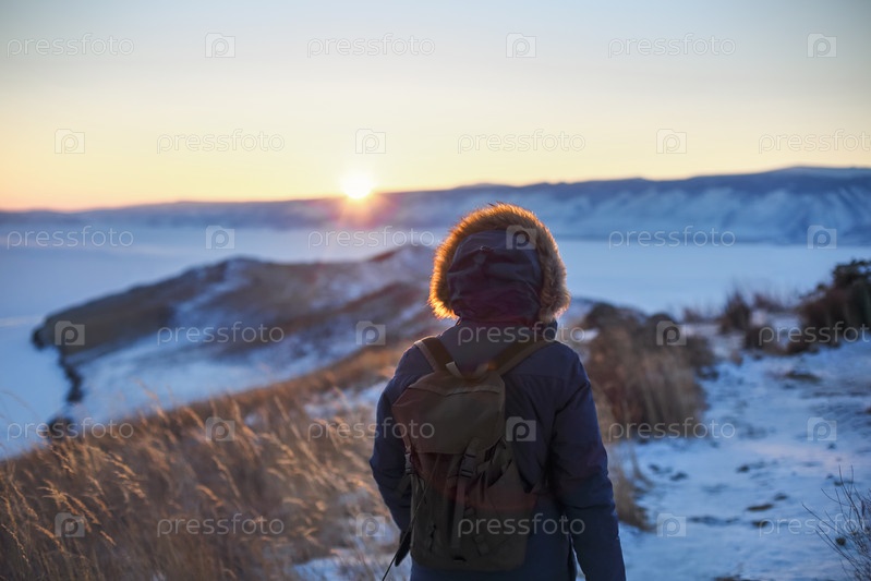 Молодой человек, стоящий на зимней замороженной природе. Остров Огой, озеро Байкал, Сибирь, Россия