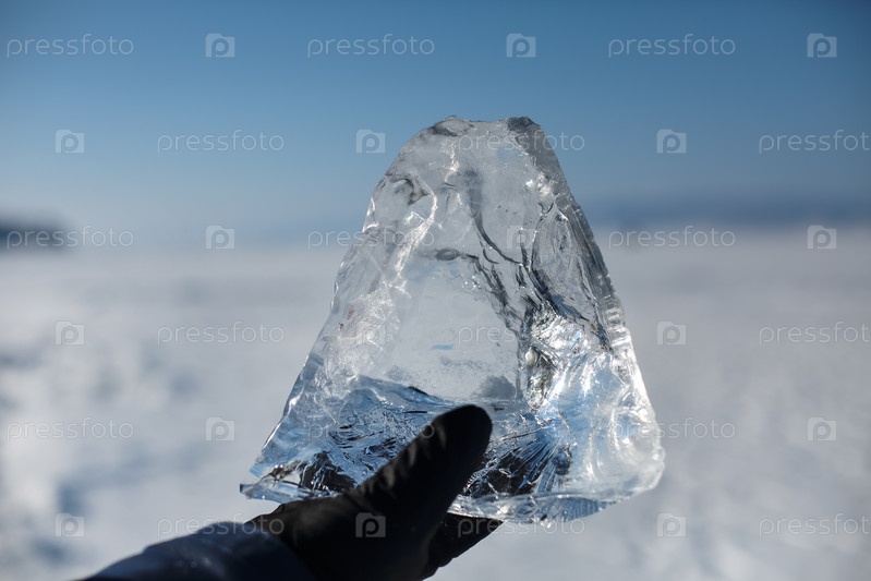 Счастливый улыбающийся мужчина в зимней синей куртке и с кусочком прозрачного дробленого льда в руках. Солнце светит сквозь грани кубиков льда. Льдины похожи на бриллианты