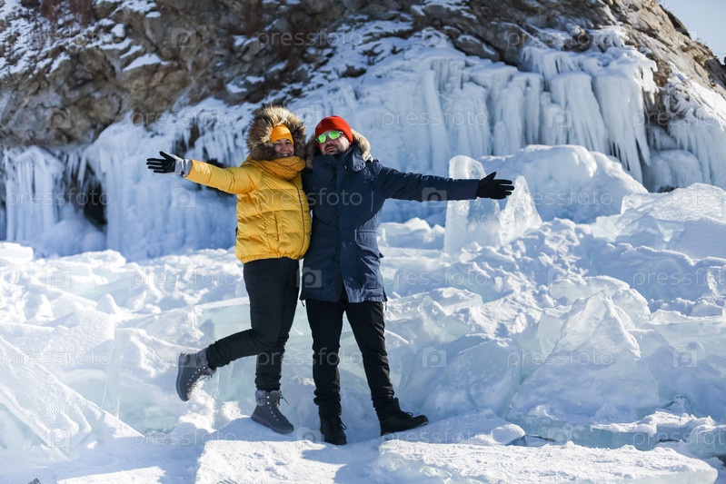 Счастливая пара на замерзшем зимнем озере Байкал