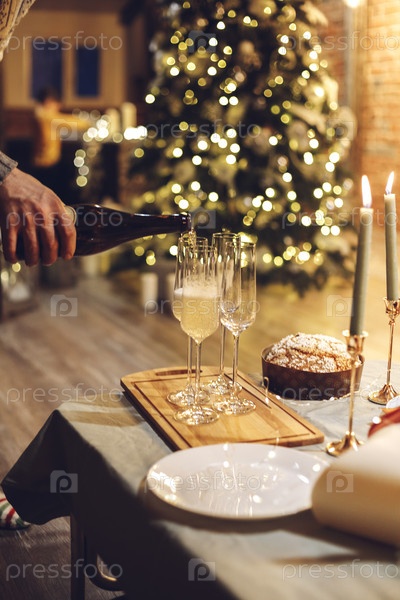 Празднование Нового года. Мужчина наливает шампанское в бокалы, стоящие на столе с праздничным рождественским ужином, свечами и завернутыми подарками на размытом фоне кирпичного камина и елки, обрезанные