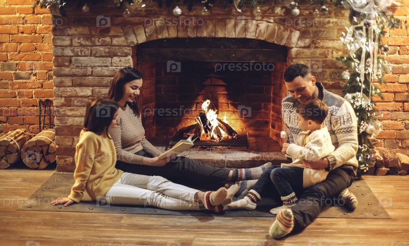 Счастливые семейные родители с двумя детьми отдыхают у камина во время зимних каникул в уютном загородном доме