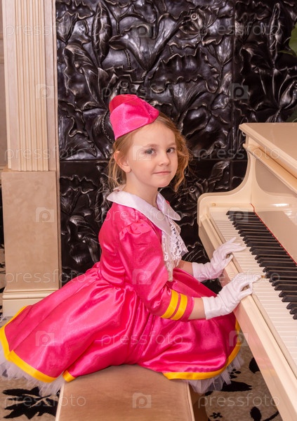 Девочка в красивом модном платье играет на белом рояле