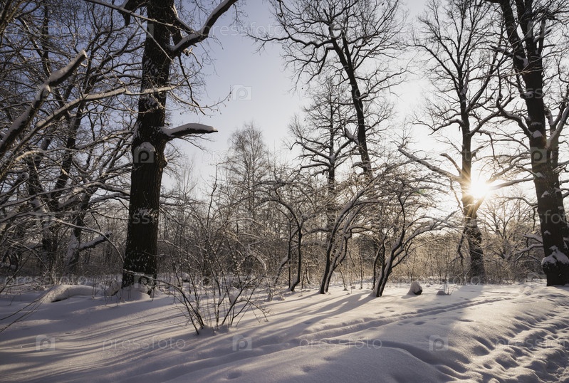 Зимний снежный лес на закате