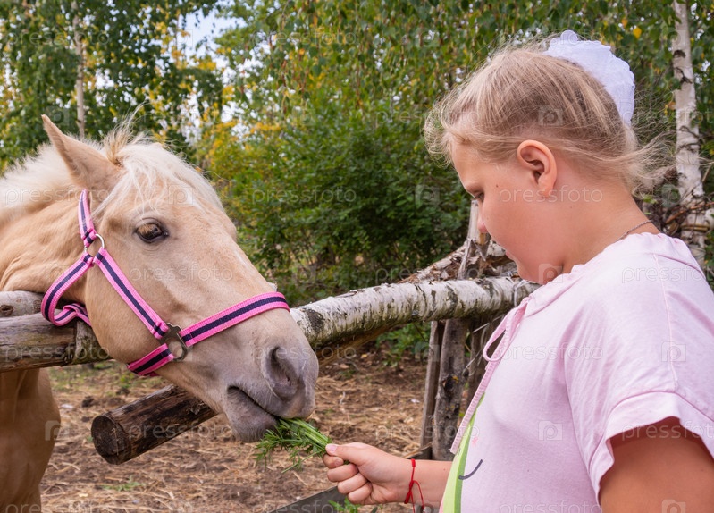 На улице в прекрасный теплый день девочка кормит лошадь