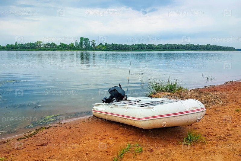 Надувная рыбацкая лодка с мотором и удочкой на берегу реки