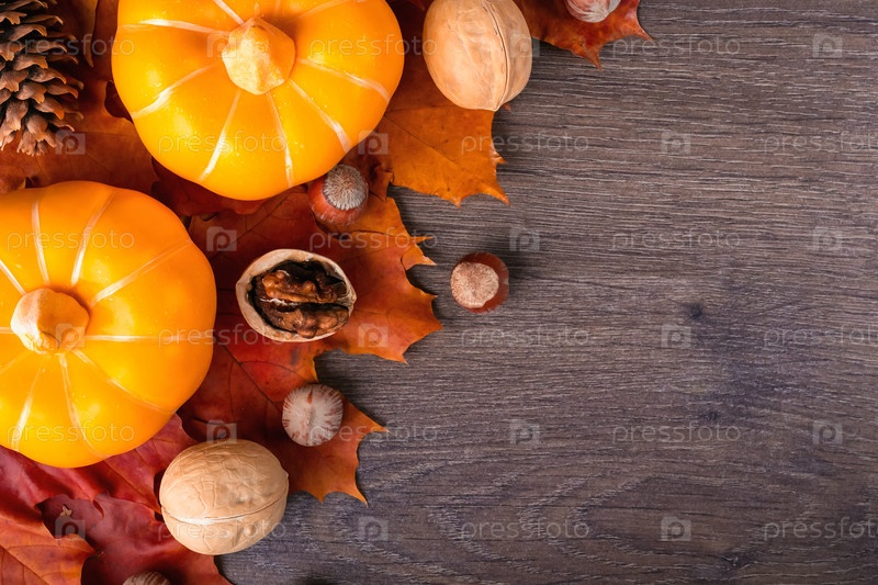 Осенний фон с кленовыми листьями, тыквами, грецкими орехами и каштанами