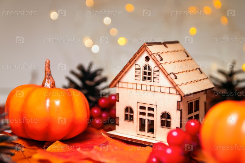Осенний фон с тыквами, шишками, каштанами, рябиной и боке из деревянного дома