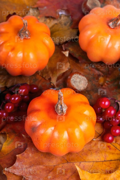 Осенний фон с кленовыми листьями, оранжевой тыквой, шишками, каштанами и рябиной