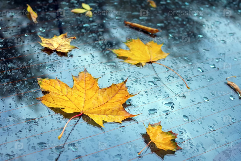 Желтые опавшие осенние листья на мокром окне автомобиля с каплями дождя