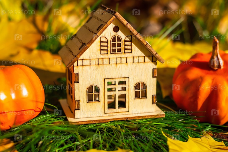 Деревянный игрушечный домик с оранжевыми тыквами на зеленой траве с желтыми кленовыми листьями на закате