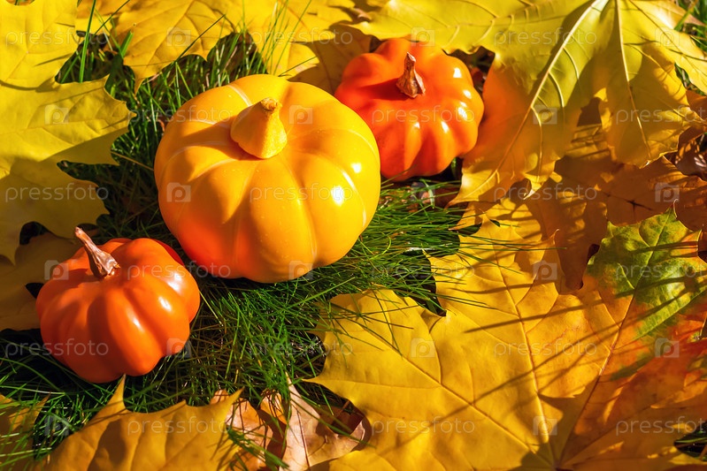 Тыквы на зеленой траве с желтыми и оранжевыми кленовыми листами